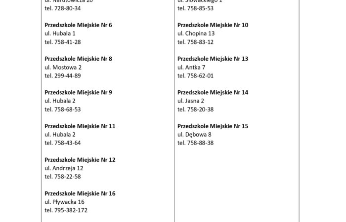 | Przedszkole Miejskie Nr 2 ul. Partyzantów 2/4 tel. 739-12-53 Przedszkole Miejskie Nr 3 ul. Chopina 1 tel. 758-68-32 Integracyjne Przedszkole Miejskie Nr 5 ul. Narutowicza 20 tel. 728-80-34 Przedszkole Miejskie Nr 6 ul. Hubala 1 tel. 758-41-28 Przedszkole Miejskie Nr 8 ul. Mostowa 2 tel. 299-44-89 Przedszkole Miejskie Nr 9 ul. Hubala 2 tel. 758-68-53 Przedszkole Miejskie Nr 11 ul. Hubala 2 tel. 758-43-64 Przedszkole Miejskie Nr 12 ul. Andrzeja 12 tel. 758-22-58 Przedszkole Miejskie Nr 16 ul. Pływacka 16 tel. 795-382-172 | Przedszkole Miejskie Nr 1 ul. Jarzynowa 21 tel. 299-11-56 Przedszkole Miejskie Nr 4 ul. Prusa 27 tel. 758-89-29 Przedszkole Miejskie Nr 7 ul. Słowackiego 1 tel. 758-85-53 Przedszkole Miejskie Nr 10 ul. Chopina 13 tel. 758-83-12 Przedszkole Miejskie Nr 13 ul. Antka 7 tel. 758-62-01 Przedszkole Miejskie Nr 14 ul. Jasna 2 tel. 758-20-38 Przedszkole Miejskie Nr 15 ul. Dębowa 8 tel. 758-88-38 |