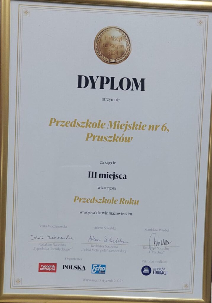 15 stycznia w Domu Kultury Kadr miało miejsce wręczenie nagród w „Plebiscycie Edukacyjnym 2024”. Bardzo dziękujemy za to wyróżnienie. Nasze przedszkole otrzymało I miejsce w powiecie pruszkowskim w kategorii „Przedszkole Roku” oraz III miejsce w województwie mazowieckim.